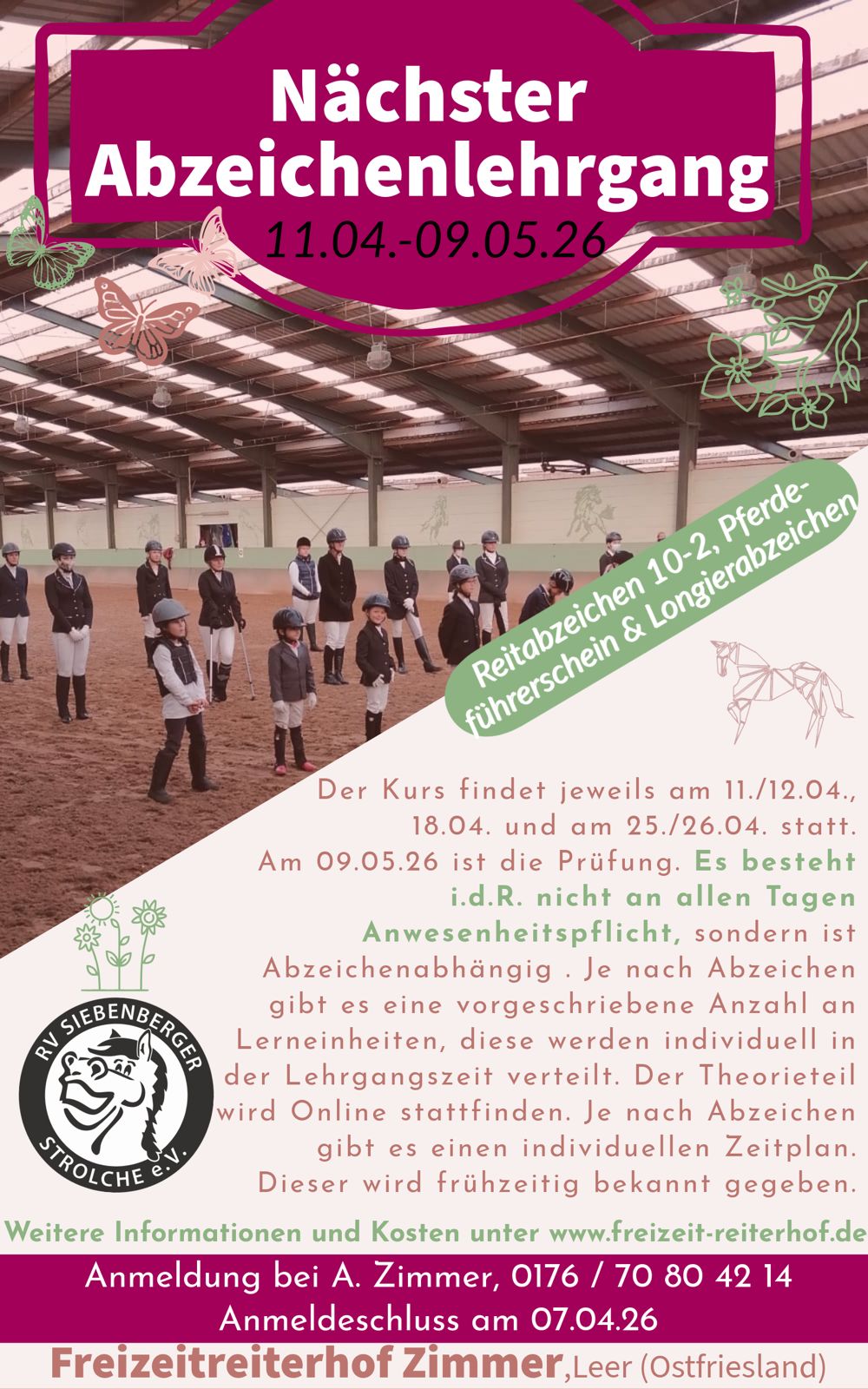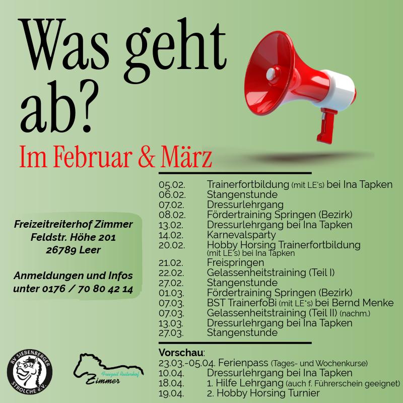 Jedes Jahr werden viele Lehrgänge und Veranstaltungen von uns, dem Freizeitreiterhof Zimmer und dem Reitverein Siebenberger Strolche e.V. Organisiert. Im Kalender findest Du alle gemeinsamen Termine vom Freizeitreiterhof Zimmer und dem Reitverein Siebenberger Strolche e.V. Eine Übersicht der Veranstaltungen in Textform befindet sich gleich hier unten.